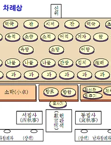 제주가 차례상(신위를 모시는 쪽)을 바라보아 앞쪽이 북, 오른 쪽을 동, 왼쪽을 서로 한다. 지역이나 집안의 전통에 따라 다를 수는 있으나 보통 차례상은 5줄로 진설하는데, 제주 앞쪽에서부터 과일, 반찬, 탕, 적과 전, 술잔과(앞에서 보아 왼쪽에) 명절음식을 놓는다. * 5번줄 : 과일을 놓는 줄로 “조율이시”라 하여 동쪽부터 대추, 밤, 배(사과), 감(곶감)의 순서로 차리거나, “홍동백서”라 하여 붉은색 과일은 동쪽, 흰색 과일은 서쪽에 차리며(대추는 동쪽에, 밤은 서쪽에), 그 이외의 과일은 순서가 없으나, 나무과일, 넝쿨 과일 순으로 놓는다. 과일 줄의 끝이나 가운데에 과자류를 놓는다. 고례에는 어떤 예서에도 과실별 위치가 명시 되지 않았는데 이유는 계절과 지방에 다라 과실이 다르기 때문이다. ..