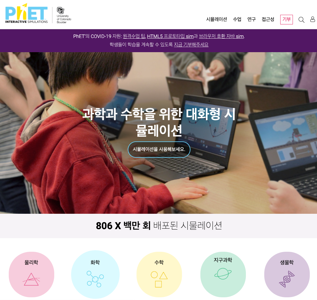 2002년 노벨상 수상자인 Carl Wieman에 의해 제작된 콜로라도대학교의 PhET 대화형 시뮬레이션 프로젝트로 무료 과학 및 수학 시뮬레이션을 제작해왔다. 이들 PhET 시뮬레이션은 광범위한 연구기반에 의해 제작되었고, 학생들이 탐구와 발견을 통해 학습할 수 있는 게임과 같은 학습 환경을 제공하고 있다.