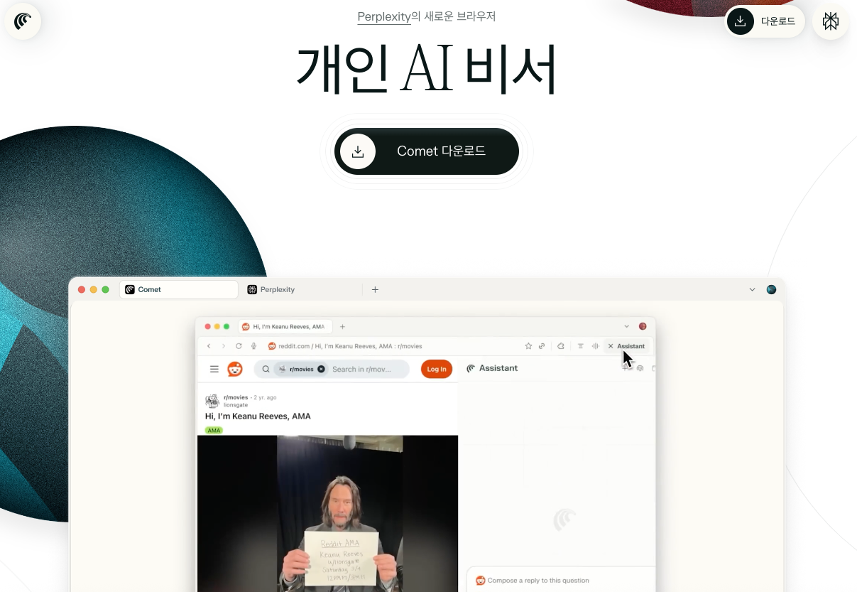 인공지능 서비스 Perplexity에서 만든 Comet를 설치해 보세요. 설명이 필요없는 최고의 AI 브라우저라고 생각합니다.