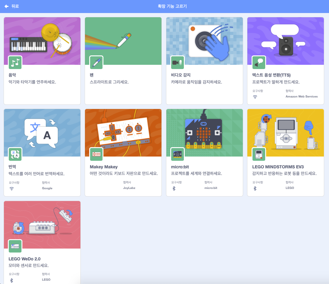 - 그리고 아마존, 구글, 마이크로비트, 레고 등 협력사들의 지원으로 해당 회사들의 제품이 지원되는 확장기능이 추가 되었습니다. 텍스트 음성 변환, 번역, 마이크로비트와 Lego Mindstorms EV3 등 새로운 확장 기능들이 생겼습니다.